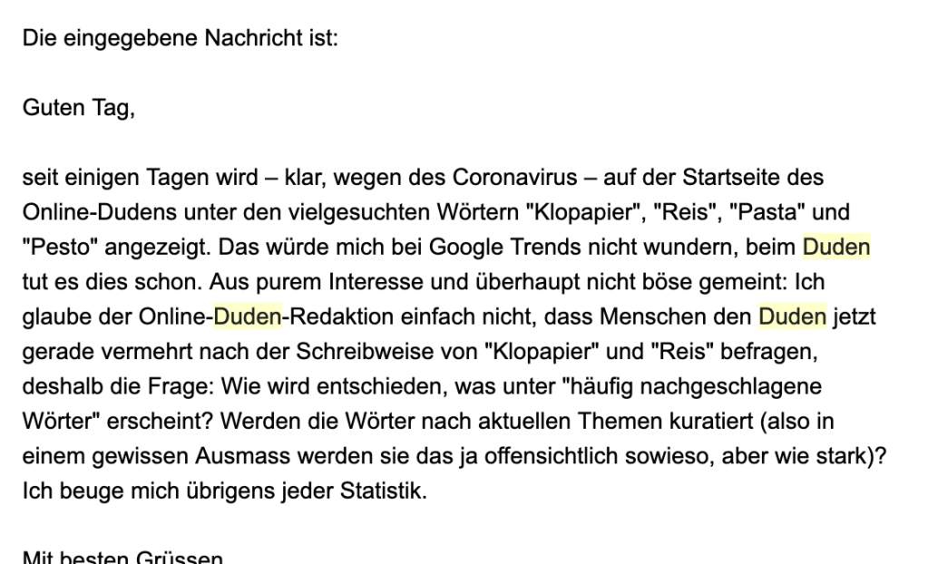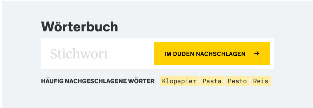 Diese Wörter wurden laut der Online-Duden-Webseite so ungefähr Mitte März 2020 „häufig nachgeschlagen“. Natürlich (und hier für die Nachwelt): Das sind die Wörter bzw. Produkte, ohne die es die Welt zu jener Märzenzeit nicht durch die Corona-Krise geschafft hätte. Bei Google-Trends erstaunt eine solche Suche also nicht unbedingt (man muss ja googeln, ob’s im Supermarkt um die Ecke noch „Reis“ gibt und wieviel 500 Gramm „Pasta“ jetzt kosten). Bei einem Wörterbuch ist die Schlagwortsuche doch kurios. Meine erste Annahme war, dass der Online-Duden einfach schummelt und sich die Wörter bei Google Trends o.ä. besorgt hat – das hat aber nur sehr bedingt mit den Google Trends jener Zeit übereingestimmt („Klopapier“ wurde tatsächlich wie verrückt gegoogelt, aber z.B. für „Pasta“ habe ich keine entsprechende Google-Statistik gefunden). Jedenfalls liegt die Vermutung nahe, dass die „häufig nachgeschlagenen Wörter“ mehr oder weniger stark kuratiert sind. Das ist ja auch sinnvoll, sonst würden dort konsequent Dinge wie „wi(e)dersprechen“ und „R(h)yt(h)mus“ die Charts anführen. Ich hab mal beim Duden nachgefragt: