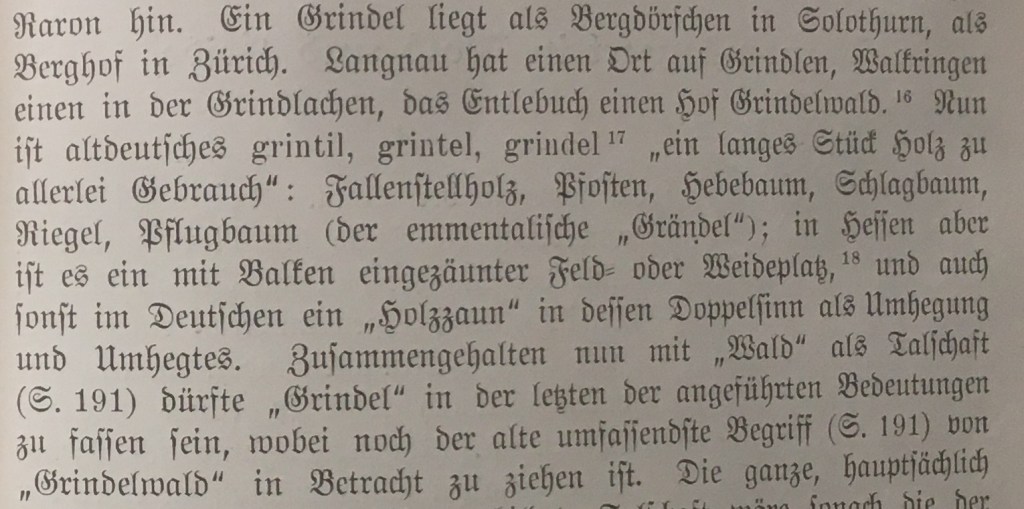 3. Grindelwald hat seinen Namen eher nicht von «Grind» genannten Felsen, wahrscheinlicher ist laut den einschlägigen Quellen eine Verbindung zum in Flurnamen hier und da anzutreffenden «Grindel» oder «Grendel», das einen Schlagbaum, Holzriegel oder Holzzaun bezeichnet, der etwas absperrt (s.u. Friedli 1908). Im Althochdeutschen schon als grintil, grintel, grindel usw. vorhanden, und in der Form «Grindel» scheint das laut Duden sogar noch ein (landschaftlich) heute in dieser Bedeutung gebrauchtes Wort zu sein. Who knew! Die Version, dass sich Grindelwald von Felsköpfen herleitet, wird, wie ich erfahren durfte, von einigen Einheimischen hartnäckig hochgehalten (mit Ausschmückungen, dass z.B. die Grindelwalder den Talboden hinaufzogen, um oberhalb von bestimmten «Grinden» aka Felsköpfen zu wohnen, falls diese herunterrollen sollten usw.), aber neben den Fachquellen präferiert sogar die kommerziell-lokalpatriotische Webseite Wir Grindelwalder die verbuchte grintil-Version. Und ausführlich dargestellt ist diese in einer frühen Quelle, nämlich: Friedli, Emanuel: Bärndütsch als Spiegel bernischen Volkstums. Zweiter Band: Grindelwald. Bern: Francke 1908, 192f.