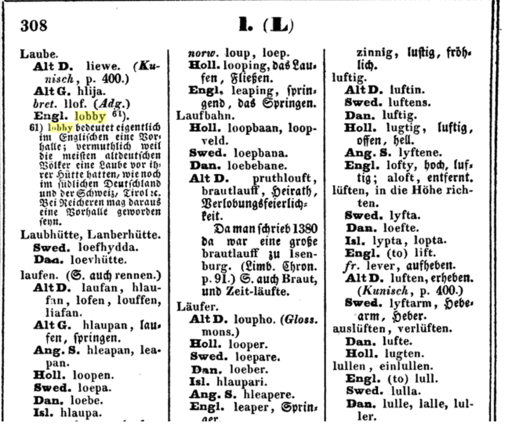 Ein Blick in dieses Werk aus dem frühen 19. Jahrhundert zeigt, dass es das Wort Lobby im deutschen damals eher noch nicht gab, sondern noch übersetzt und etymologisch mit Laube in Verbindung gebracht wird, was das DWDS bestätigt.