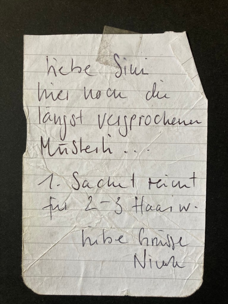 Ein Fundzettel, Volume 108. Nicole kommentiert darin eine Gabe an die „liebe Simi“. Ein Sachet reicht für 2 bis 3 Haarwäschen. Der Klebstreifen weist darauf hin, dass der Zettel an einer Tür, einem Umschlag oder einer Tüte angeklebt war. Charmant und gefällig sind die drei Punkte in der Mitte der Mitteilung, die auf eine lange Geschichte hinweisen: „hier noch die längst versprochenen Müsterli . . .“ – dann die unmittelbare Wendung auf Dosierung und Anwendung der Gabe. Nicole hat mit relativ grossen Buchstaben den ganzen Zettel ausgenutzt, mit der typischen, halbgebundenen Schreibschrift, wie sie in Schweizer Schulen zwischen 1940 und 2010 gelehrt wurde. Die Grösse der Schrift führt dann überraschend dazu, dass ein wichtiges Wort nicht ausgeschrieben werden kann, aus Haarwäschen wird Haarw. Ein schönes Stück, aber charmanter als es interessant ist.