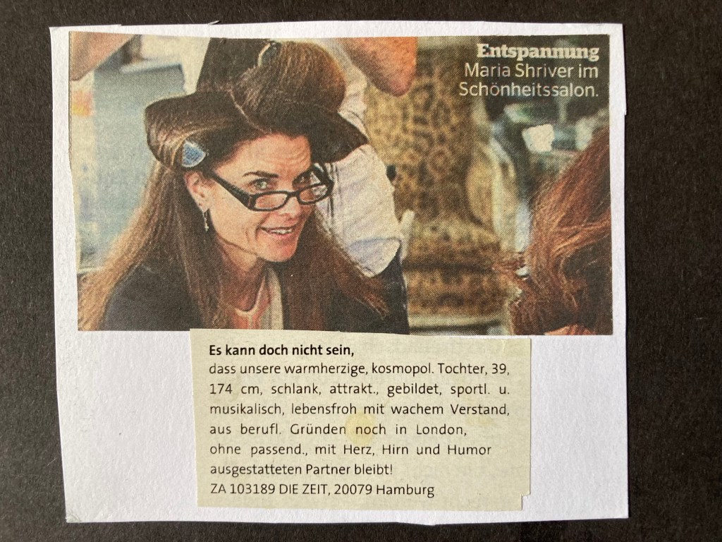 Maria Shriver in einem sympathischen Foto mit wildem Haristyle und Birlle. Darunter eine gefundene Partnervermittlungsannonce, in der verzweifelte Eltern sehr rührend versuchen, ihre Tochter zu verkuppeln. DIe Beschreibung lässt eigentlich nur den Schluss zu, dass die 39-jährige Tochter ungebunden bleiben und in London Karriere machen möchte, während die Eltern endlich Enkel einfordern.