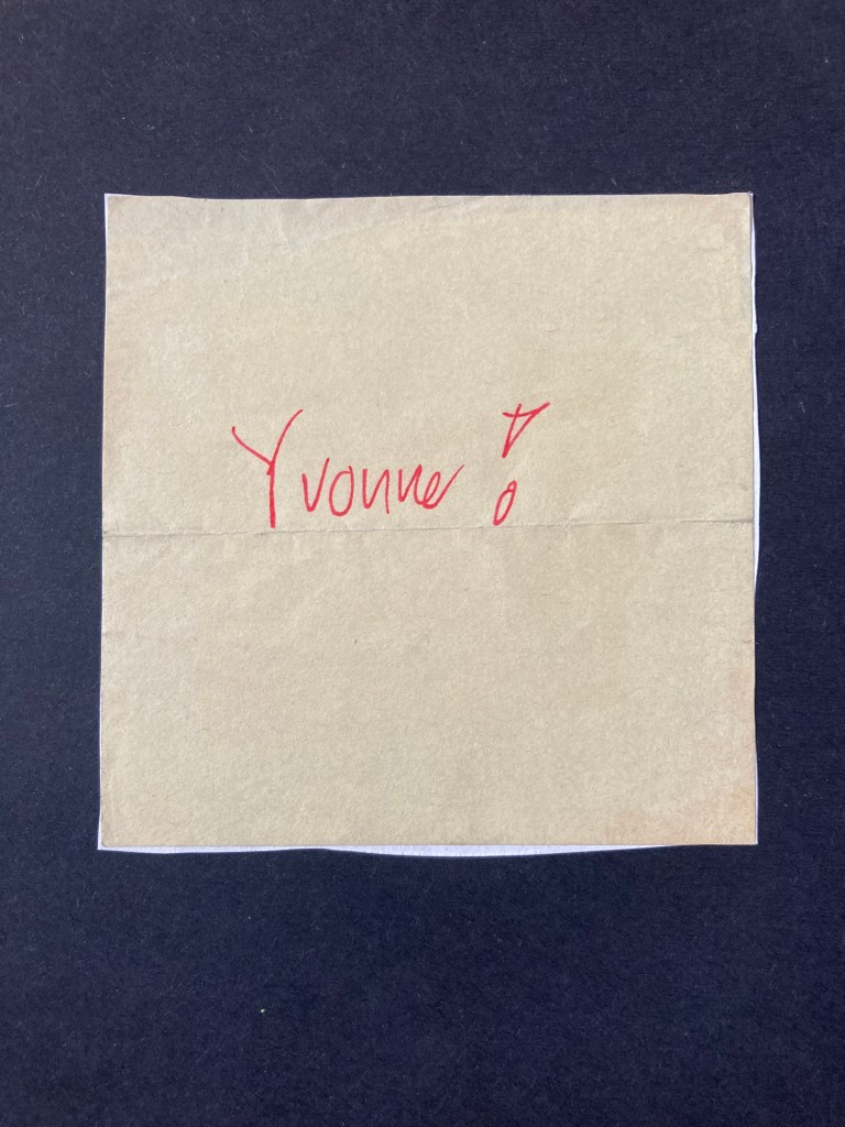 Ein blassgelber, quadratischer Zettel. Zentriert in lockeren, aber streng senkrechten Buchstaben in roter Farbe das Wort „Yvonne!“ mit massivem Ausrufezeichen. Es ist leicht, sich für den Zettel eine eigentliche Funktion auszudenken. Als Fundstück allerdings wirkt es, als ob der Zettel uns anschreit. Er schreit nach Yvonne.