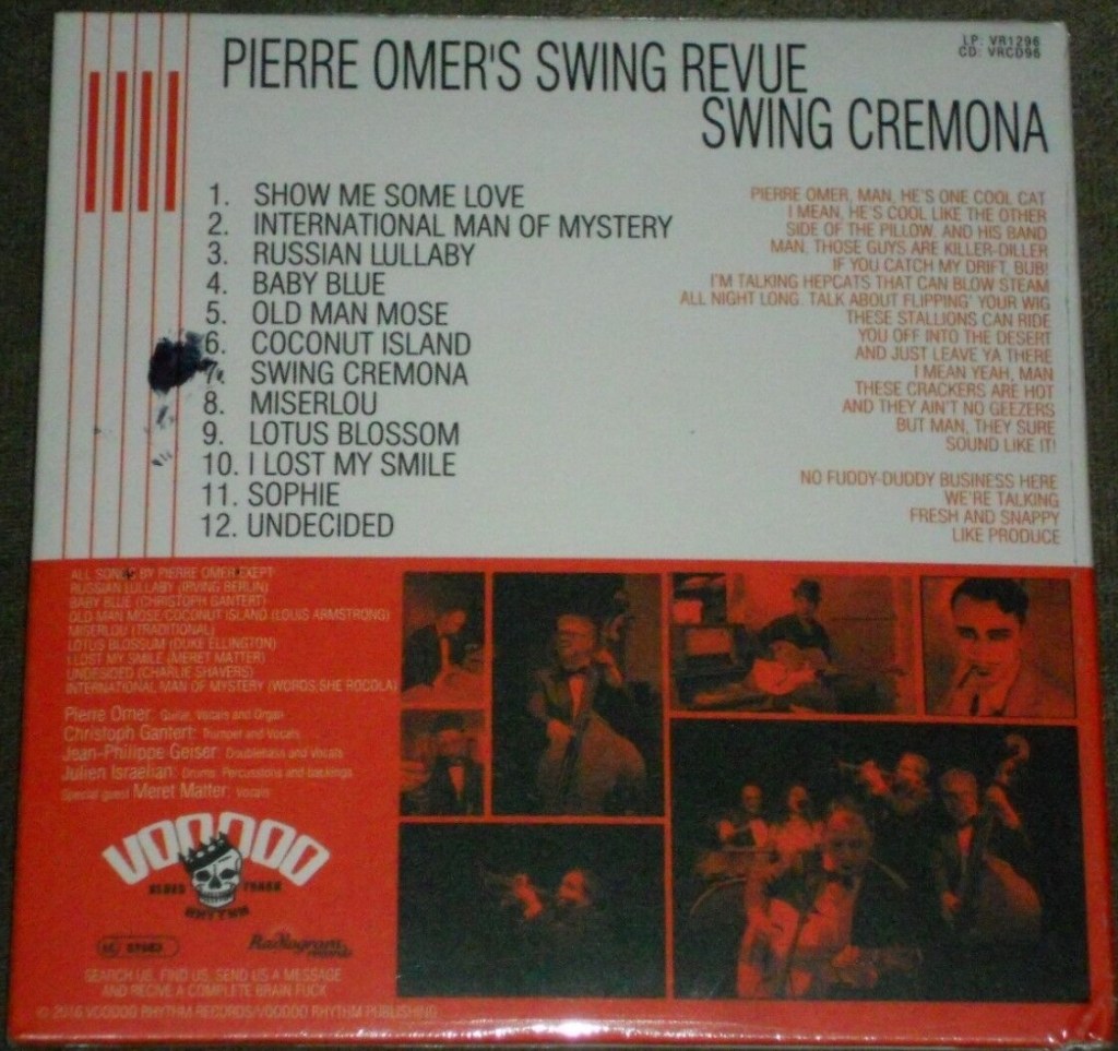 Ditching his psychobilly approach for once to fully lean into a slightly amplified, sort of ragged and danceable form of swing revival, Omer opts for simple pleasures instead of complicating his usual genre-mélange on the aptly named Swing Cremona. Sure, it’s jiving jazz manouche, with a muted trumpet driving many solos and a laidback electric lead guitar. Joined by two other vocalists on occasions, the Swing Revue lays down bandstand-probed, functional music that remains cheeky and tongue-in-cheek, silly on Louis Armstrong’s calypso send-up “Coconut Island”, knowingly camp on the Arabic quasi-surf rock of “Miserlou” and suave on the 1960s TV-series homage “International Man of Mystery”. It is extremely playable, light-hearted music which comes off as almost provokingly effective – attested by contributions digging deep into the 20th century entertainment playbook (Berlin, Armstrong, Ellington), treating these songs like the dance nuggets the were and are. Pierre Omer can’t hide his somewhat somber allure behind a thin moustache and the showbiz-bistro façade, and Swing Cremona fits in any place where a good time is more important than the time of day.